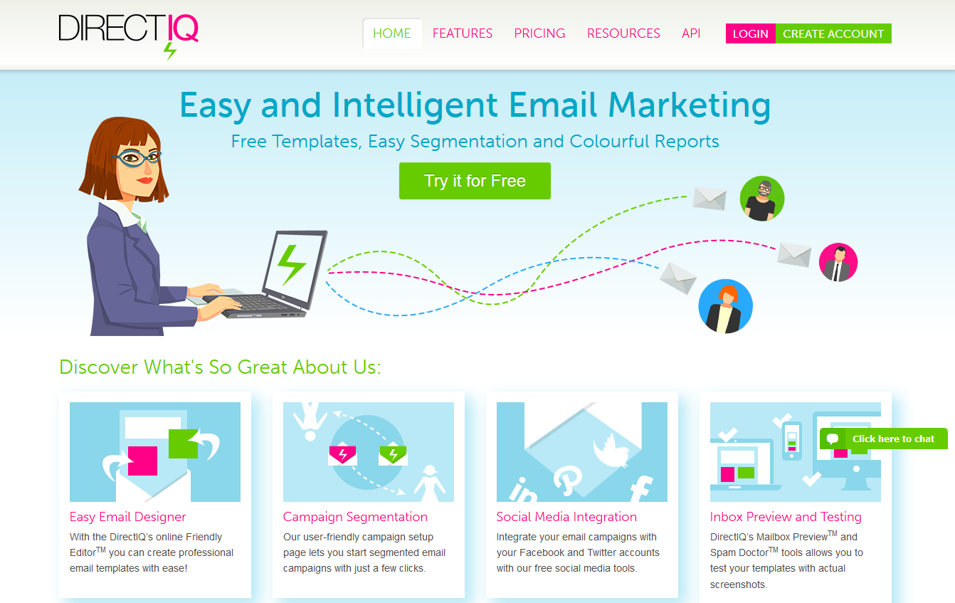 DirectIQ friendly user interface makes beginner marketers comfortable; its rich features (spam doctor, mail previews, social media integrations, mobile apps for iOS, Android, and Windows Phone) makes satisfied anyone who runs small and midsize business; and its email API also lets develop the customized email marketing approach you have to search for.