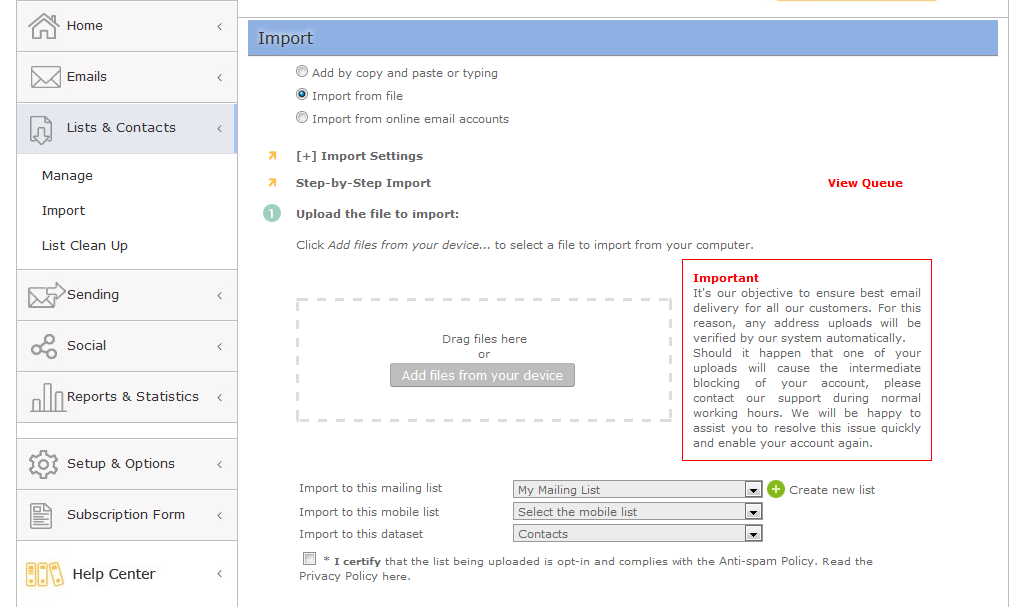 When it comes to creating the proper newsletter you can count on a great number of responsive colorful templates that you can customize using the EmailBrain email creator, dragging & dropping content blocks. You can also import templates from other sources, from Word or an HTML program too and bear in mind that – apart from the email – the footer is custom-designed to make it look colorful. Before sending your newsletter you can check it using the inbox preview tool and you can also perform an A/B split testing, integrate some useful features such as double opt-in or subscription form.
