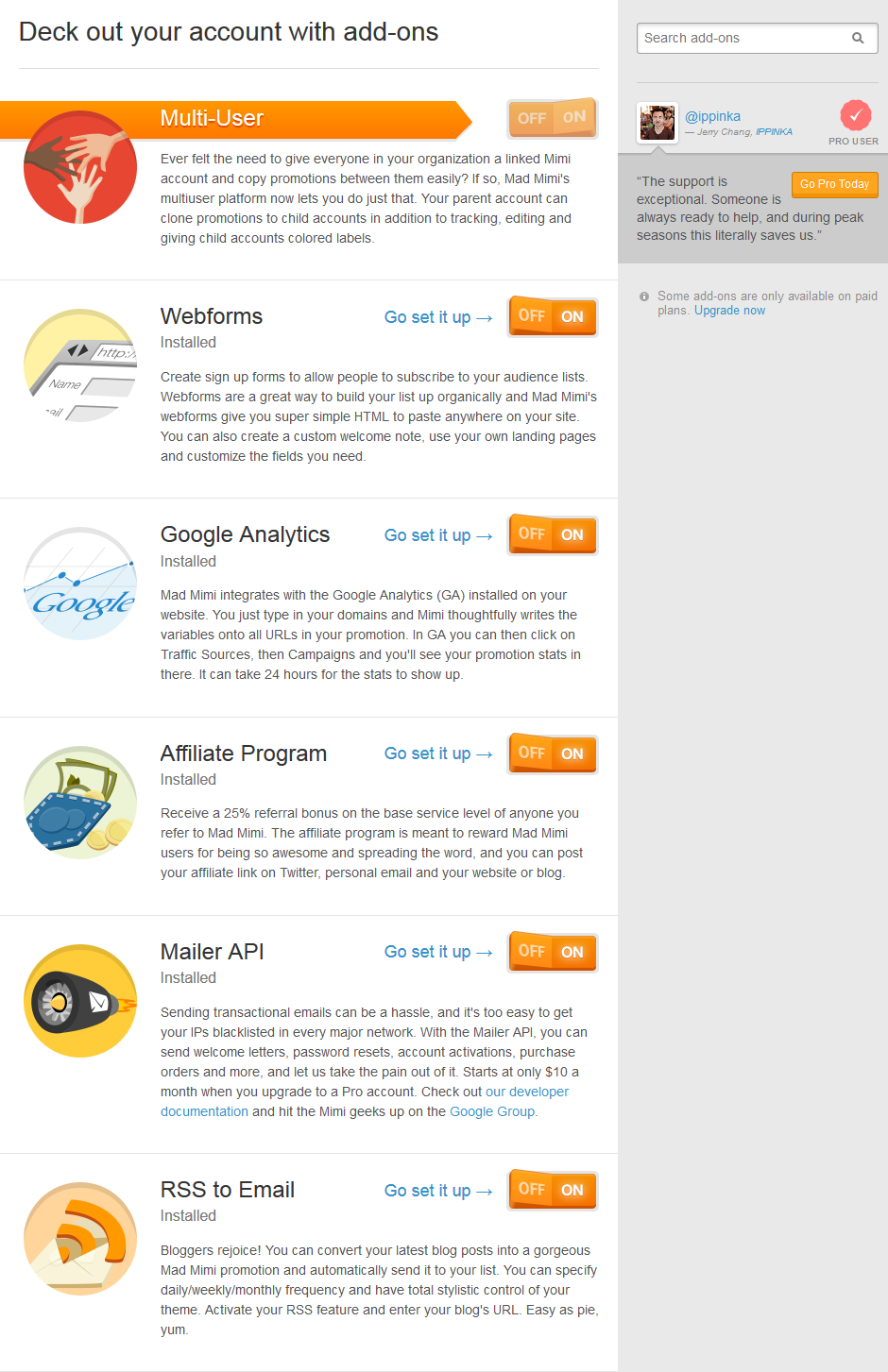 Mad Mimi provides help to the customer via instant messaging (available Monday through Friday from 9 a.m. to 6 p.m.) but they also have a 24-hour email support. The dedicated team it’s friendly and very helpful and could also schedule calls by arrangement. In the “Help” area you can find topics that answer to the most common users’ question and some videos can help you to get started with Mad Mimi.