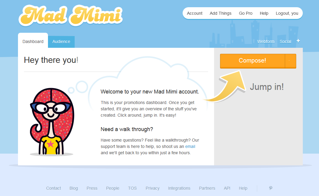 One of the most noticeable things of Mad Mimi is the fun, sleek and intuitive interface that makes you immediately feel comfortable with all the email marketing situation. Sometimes email software can be confusing indeed, plenty of features and settings you don’t need, but Mad Mimi tries to keep things simple. So, after signing up, you’ll see a button jump directly on composing your first campaign, the “Dashboard” section and the “Audience” tab, in which you can create your lists and add contacts (one by one or uploading CSV, TXT, vCard & Excel files).