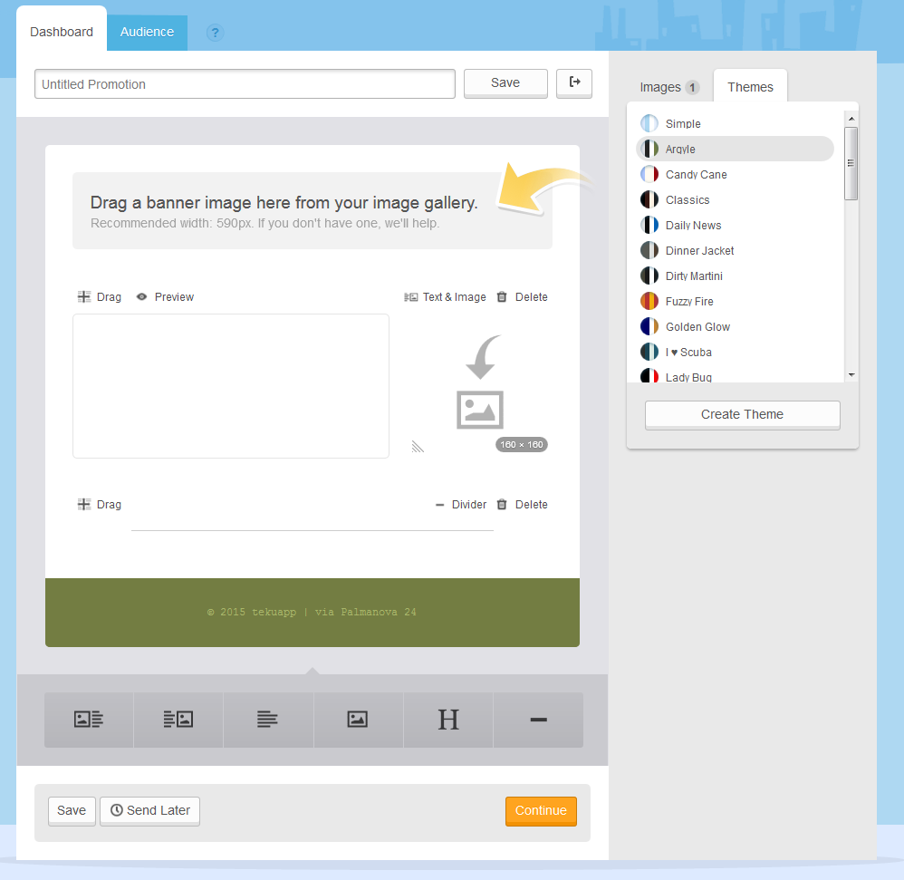Upon the right you’ll see a plus sign: it means you can show or hide a lot of add-ons (30 until now, but not all available with the free trial) to customize your UI and your whole newsletter campaign: a simple and smart idea to create your personal “features palette”. When it comes to creating the email, Mad Mimi provides simplified design tools to customize one basic but beautiful template with colorful themes and some text modules to edit different areas. You can then upload photos, images and so on and simply drag them into the workspace to polish your newsletter. If you want to use your HTML, you have to return on the main “Compose” button and choose the option from the drop down menu (but the option is available only for Pro users). Also, if we have to say that Mad Mimi, in general, isn’t very recommended for those who want to use their email code because this service has some lack of HTML editing tools.