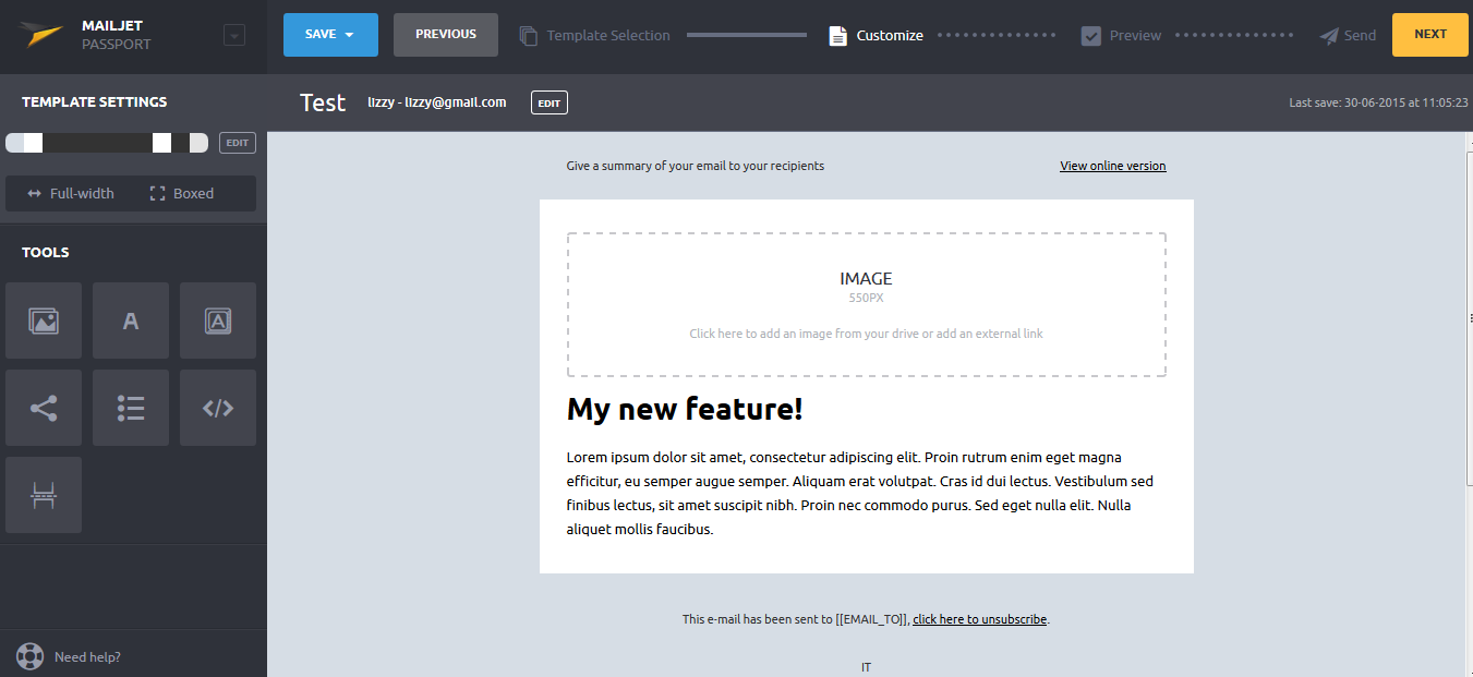 When it comes to building your email marketing campaign all you have to do is follow the confusing instructions on the dedicated area, starting with the creation of your template. You can do it in a three-way: you can choose and edit one of the Mailjet’s ready made layouts, create your own with a dedicated drag&drop template builder or use their HTML editor. You can also upload and save your templates to reuse them whenever you want, although it’s far from easy or intuitive. Then you can send your email campaign through your app’s API integration or from Mailjet’s user interface.