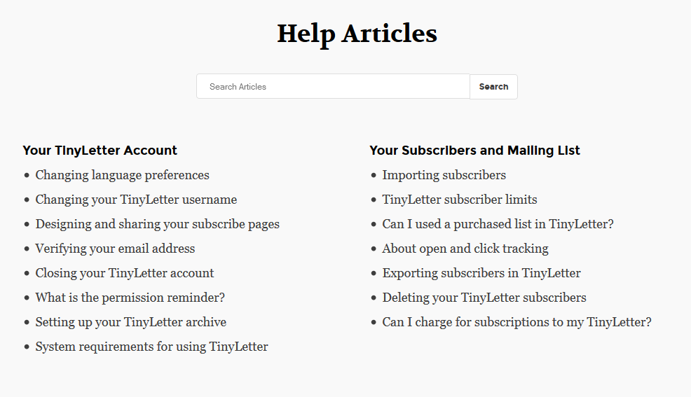 TinyLetter’s support is basical as well as the service itself, providing a useful yet minimal help articles’ page and a contact form you can fill in the very remote case you could have problems with your newsletter.