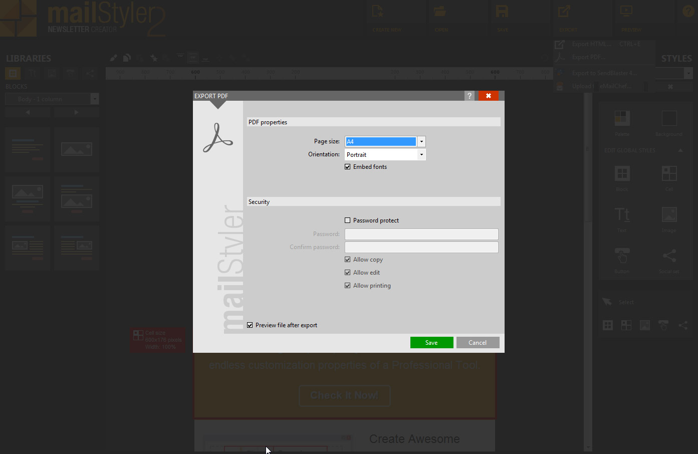Of course, your templates can be imported in all the major email marketing platform, like MailChimp, SendBlaster, and so forth. MailStyler 2 introduces some interesting news: you can now insert images, icons and elements in preset blocks. It’s also easy to merge or separate multiple cells, adjust spaces and sizes, and copy the style of a cell or a block to another cell or block. If you need it, you can add predefined graphic styles to texts and overlay text on images to create dynamic banners.
