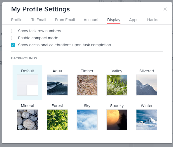 You can select one of a small number of kitschy backgrounds to replace the default grey. And you can opt to see occasional celebrations when you complete a task, a nice addition to the satisfaction of marking that checkbox when you upload a finished document.