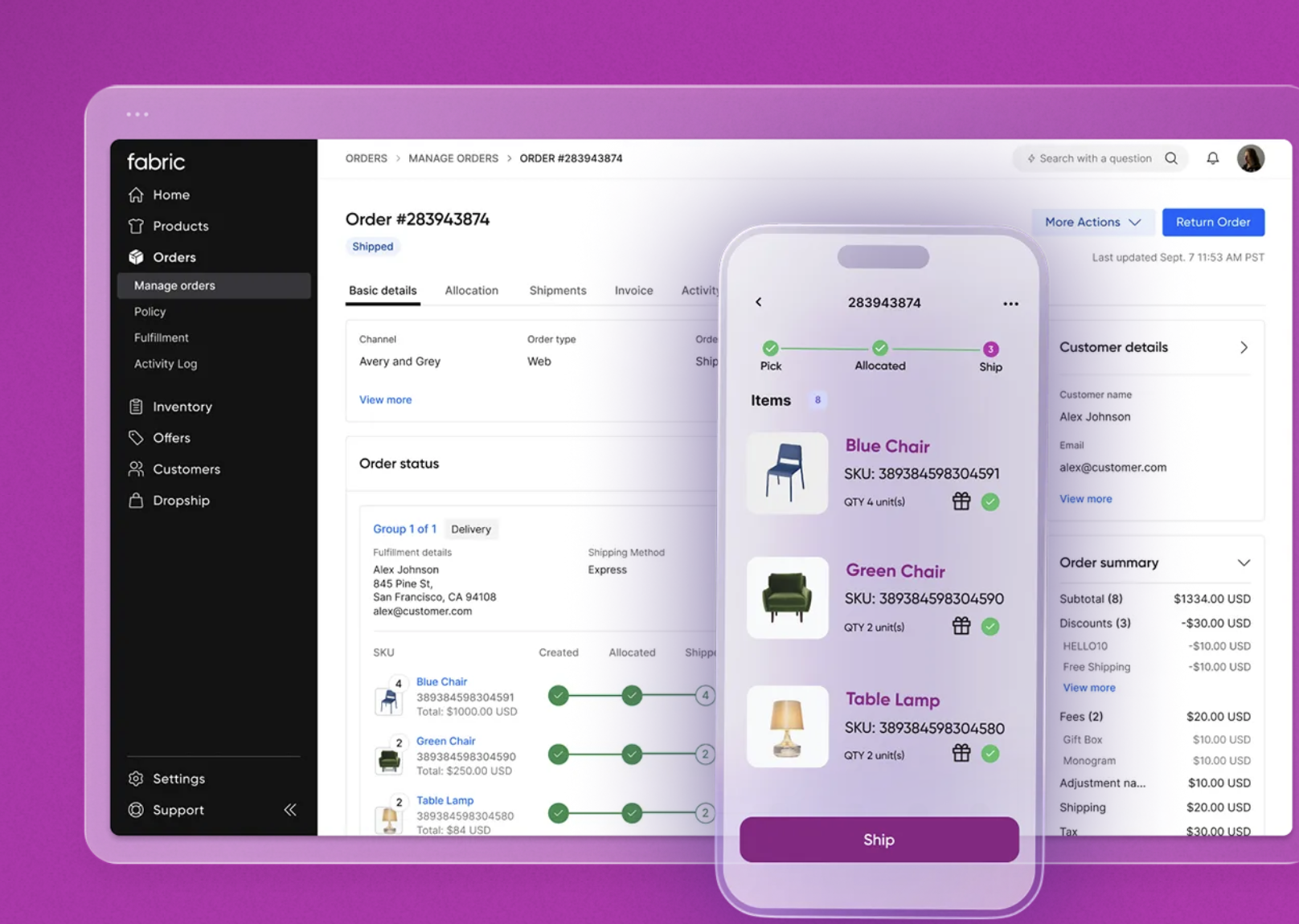By utilizing Fabric‘s REST APIs, businesses can separate the front end of their sales channels from the back-end systems to customize experiences such as adding items to the cart, validating promotions, retrieving batch data, and more. Managers can process orders from multiple channels, track warehouse activities, and enable customers to split payments between gift cards and credit cards, PayPal, and other platforms.