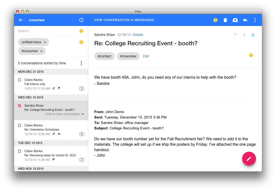 Inky è un client per email pensato per fornire un’alternativa dal design accattivante ad Outlook. È disponibile sia nella versione gratuita che in una versione pro: entrambe godono del setup unico per tutti i dispositivi, sia desktop che mobile. Se lavorate su diversi dispositivi, Inky potrebbe essere la scelta giusta per voi.