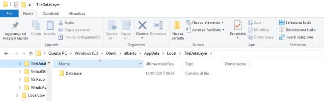 • Copiate il backup della cartella chiamata Database esattamente dove l’avevate trovata, rifacendo il percorso Windows (C:)> Utenti > [Il vostro username] > AppData > Local > TileDataLayer.