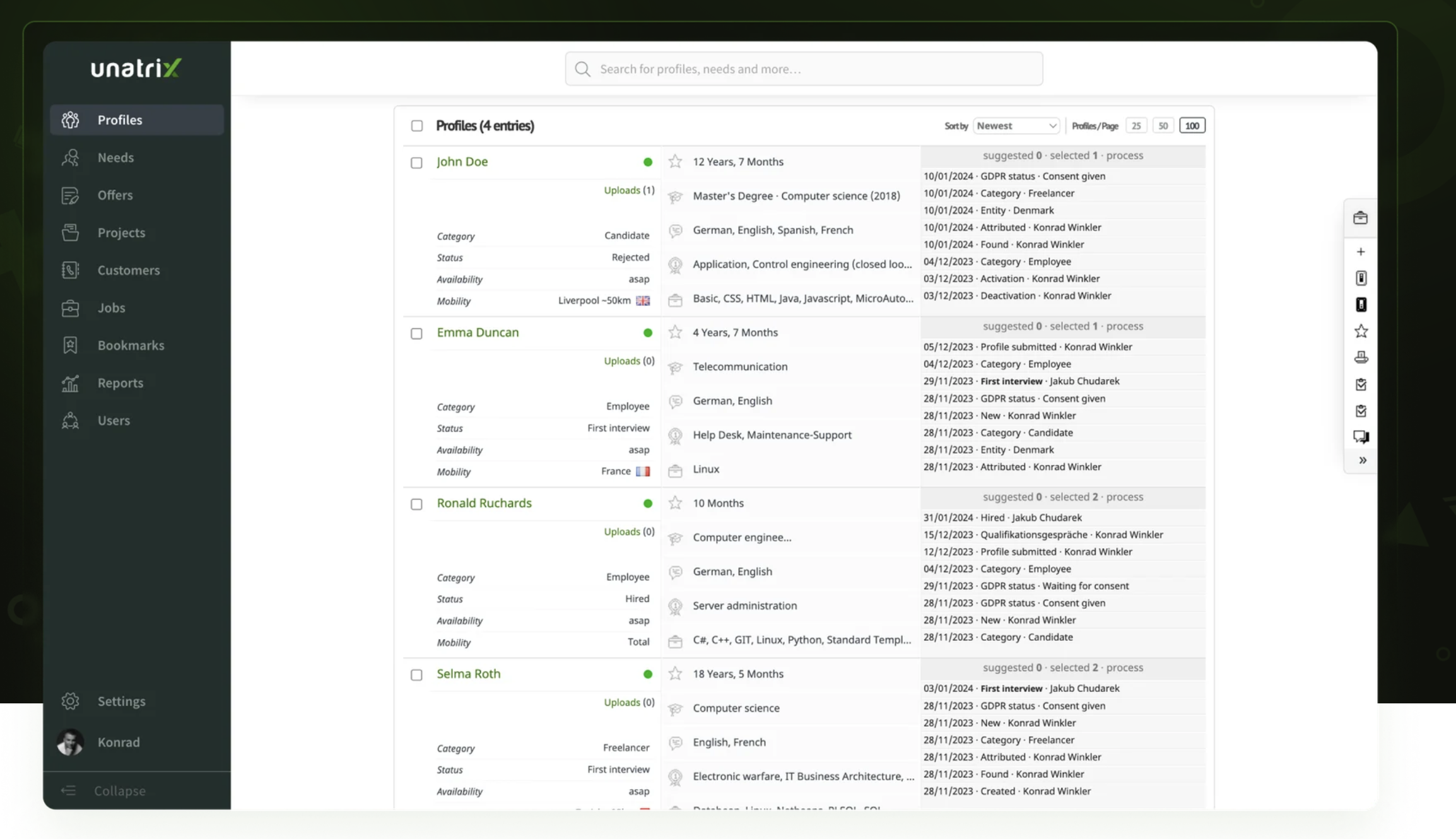 Unatrix è una piattaforma progettata per integrare le funzionalità di ATS (Applicant Tracking System) e CRM (Customer Relationship Management), con particolare attenzione alle esigenze delle agenzie per il lavoro e delle società di recruiting. La piattaforma privilegia la collaborazione, la semplificazione dei processi interni e la trasparenza all’interno dell’organizzazione. Unatrix consente ai datori di lavoro di creare descrizioni di lavoro all’interno del sistema, sia a partire da modelli precedentemente utilizzati che da zero. Gli annunci di lavoro possono quindi essere pubblicati su diversi canali, come la pagina dedicata alle carriere dell’azienda, bacheche di lavoro esterne e siti di social media come Twitter, LinkedIn e Facebook. Una volta che la persona si è candidata, il sistema crea un profilo per ciascun utente, elencandone i dati personali e le qualifiche. I reclutatori possono quindi creare delle short list di candidati altamente qualificati e inviarle ai responsabili delle assunzioni per la valutazione. Possono inoltre visualizzare la corrispondenza con ciascun candidato e il suo avanzamento durante il processo di assunzione sulla pagina del profilo del candidato.