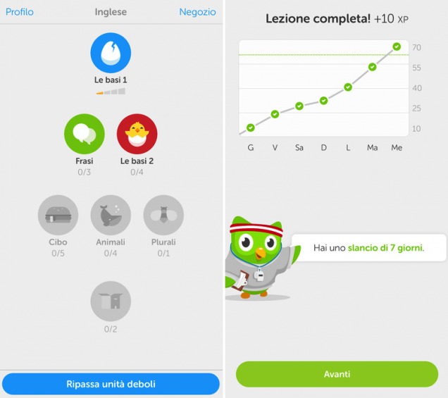 Duolingo è diventata la più conosciuta app per le lingue straniere grazie alla sua semplicità e al fatto che ha reso un gioco lo studio. Suddivisa in diverse categorie di applicazione, presenta ai suoi utenti delle piccole lezioni, il cui apprendimento viene testato immediatamente. Se l’utente sbaglia la risposta, perde una vita (come nei videogiochi: infatti si parla di “gamificazione”). L’app è pensata per presentare delle motivazioni forti per continuare a studiare, riconoscendo i progressi e premiandolo con nuovi livelli e monete virtuali – e ora anche attraverso i Club Linguistici. Con pochi minuti di sforzo quotidiano si possono imparare i rudimenti di diverse lingue: dall’italiano sono disponibili l’inglese, il francese, il tedesco e lo spagnolo. Per gli utenti di lingua inglese le scelte sono molto più ampie: c’è il portoghese, il russo, lo svedese, il turco, e ci sono anche corsi in beta, come per lo swahili e altre. E per i più ardimentosi, quest’anno arriva il corso in klingon.