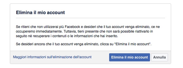 Facebook ha dovuto rendere più semplice il processo di cancellazione che, fino a un paio di anni fa, richiedeva numerosi passaggi. Adesso avete due possibilità: disattivare il vostro account (che torna visibile appena effettuate un nuovo login), oppure cancellarlo definitivamente (non sarà più recuperabile).