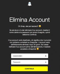 Eliminare l’account Snapchat da app è un procedimento lungo e arzigogolato. Possiamo invece eliminarlo in due semplici click da sito desktop: andate a questo indirizzo e inserite le vostre credenziali per il login.
