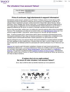 Cancellarsi da Yahoo è molto semplice: esiste un link apposito. Dovete inserire username e password, poi verrete indirizzati in una pagina in cui confermare la vostra intenzione di cancellare l’account reinserendo la password e digitando un codice captcha.