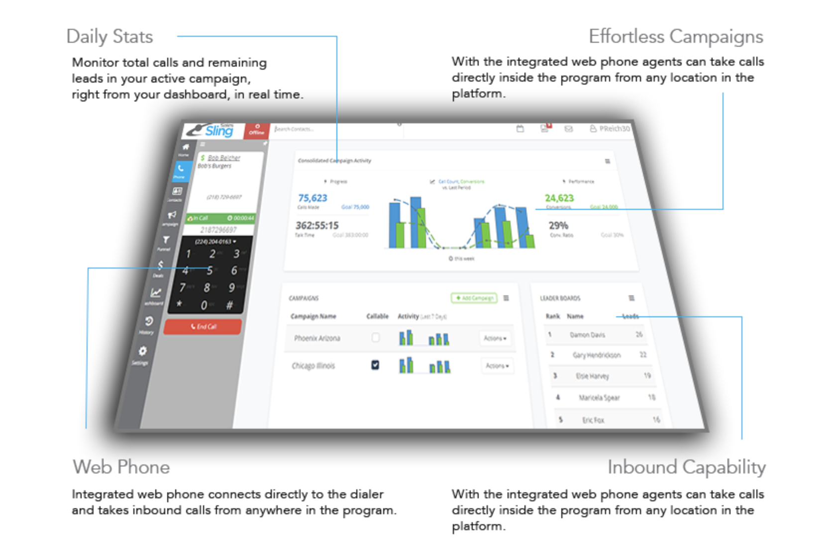 Sales Sling è un dialer basato su cloud e una piattaforma di gestione dei lead che offre strumenti per convertire i lead in vendite, amministrare le pipeline, effettuare chiamate in uscita utilizzando la funzione di composizione automatica, tracciare e registrare le chiamate in entrata e in uscita, gestire le prestazioni dei dipendenti e altro ancora. Gli strumenti di gamification, come le classifiche degli agenti, aiutano a incoraggiare gli agenti a migliorare per raggiungere gli obiettivi. Gli agenti possono essere classificati in base al numero di vendite chiuse, al numero di chiamate, al rapporto di conversione o ad altre misure personalizzate. Con Sales Sling, i team di vendita possono realizzare campagne e utilizzare il telefono web integrato per effettuare e ricevere chiamate direttamente all’interno del sistema.