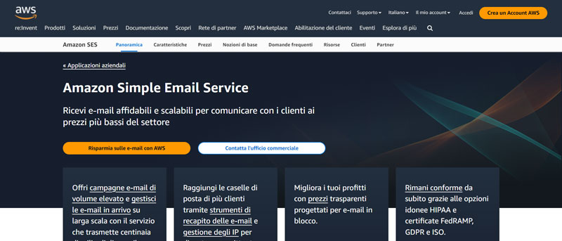 Amazon SES (Simple Email Service) è un servizio SMTP piuttosto scalabile ed economico offerto da Amazon Web Services.È progettato per consentire alle aziende di inviare email di vario tipo, tra cui comunicazioni di marketing, email transazionali, aggiornamenti relativi all’account e altro ancora. Amazon SES offre una piattaforma affidabile e sicura per l’invio di grandi volumi di email, con funzionalità per il monitoraggio delle metriche di invio, la gestione di mailing list e la personalizzazione dei messaggi.