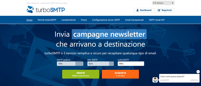 TurboSMTP è un provider di servizi SMTP che offre soluzioni per l’invio di email in modo rapido, affidabile e sicuro. Fondata nel 2009, si è affermata come una delle principali piattaforme per la gestione dell’invio di email per aziende, professionisti del marketing e sviluppatori di software.Si tratta dell’unico servizio SMTP italiano, con sede, server e indirizzi IP in Italia. In questo modo la piattaforma è capace di garantire i migliori standard di deliverability, specialmente verso i client di posta italiani come Libero, Virgilio e Tiscali.