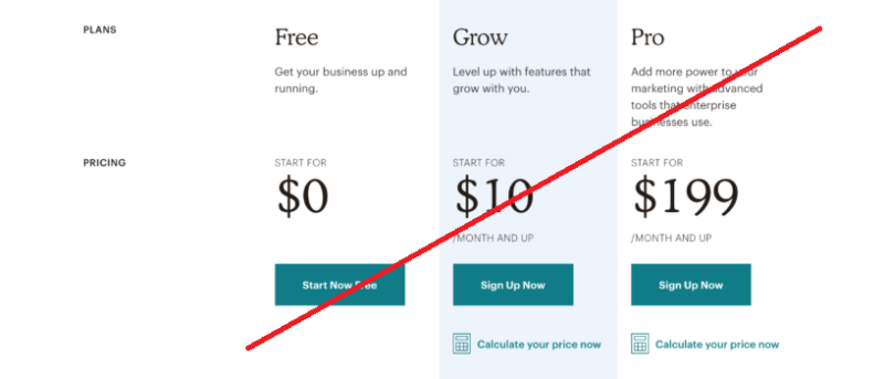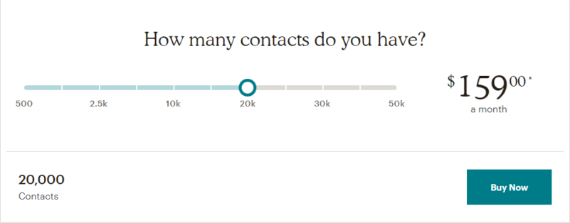 All’interno del nuovo prezziario, i tre nuovi piani a pagamento sono corredati da due asterischi ** alla voce dei contatti utilizzabili. Questo per informare gli utenti che il prezzo finale è calcolato in base alle dimensioni dell’audience. Se per esempio si intende acquistare il piano Essentials, il costo per 500 contatti in mailing list è 9,99 dollari al mese, quello per 20mila contatti è 159 dollari, fino a 259 dollari per 50mila contatti.