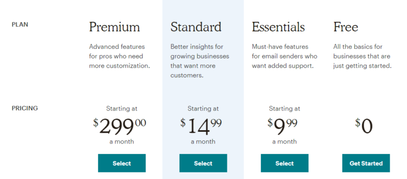 Il pacchetto Standard, inoltre, raccoglie una serie di funzioni avanzate prima disponibili con il piano Grow ora superato, per esempio l’invio delle email in relazione con i fusi orari e la possibilità di codificare da sè il proprio HTML. Questo avviene in presenza di un aumento percentuale a doppia cifra dei costi dal piano Grow a quello Standard. Uno sguardo al nuovo pannello del pricing di Mailchimp potrà chiarire la nuova distribuzione dei servizi.