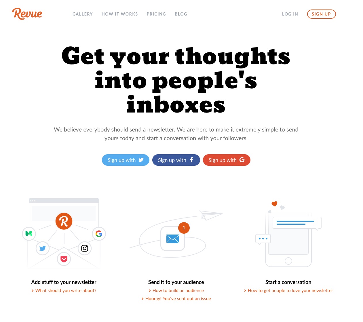 Revue è un servizio di newsletter che vi aiuta a condividere le vostre newsletter personali e le arricchisce di testo, link e immagini che troviamo online. È il tipo di servizio pensato per i social media manager, curatori, influencer, blogger o piccole aziende che hanno la necessità di una presenza online solida. Il servizio è molto carino, poco costoso e davvero piacevole da usare per condividere con il nostro pubblico quello che ci interessa, semplificando il concetto di newsletter e lasciando soltanto quello che conta.