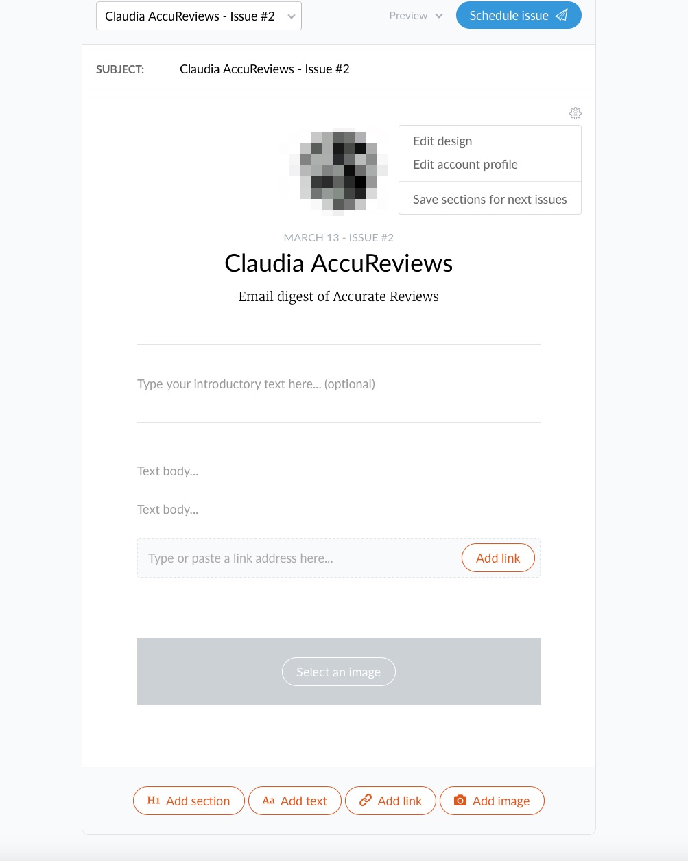 Come probabilmente immaginerete, l’editor di Revue è estremamente semplice: le opzioni di personalizzazione sono limitate, ma nonostante le newsletter spedite hanno un design moderno, piacevole, semplice. Con pochi semplici passi potete ottenere un risultato notevole, e non dovete nemmeno preoccuparvi di codice HTML o complicati editor WYSIWYG. È una delle cose migliori di Revue: può essere utilizzato anche da inesperti totali, permettendo loro di concentrarsi sulla qualità dei contenuti.