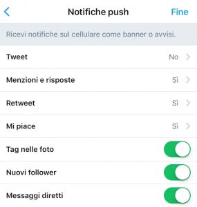 Per scegliere esattamente cosa permettere a Twitter di dirvi, andate sul vostro profilo e toccate l’icona con l’ingranaggio, scegliendo Impostazioni e privacy. Toccate “Notifiche” e poi “Notifiche Push”. Divertitevi a scegliere quello che volete ricevere.