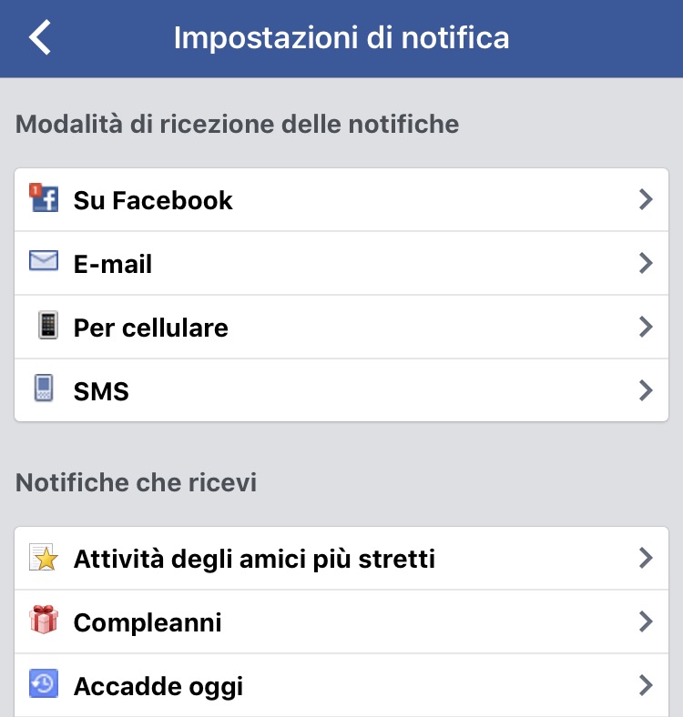 Facebook organizza le notifiche sulla base del dispositivo (Facebook su browser, notifiche email, cellulare, eccetera) e per categorie come compleanni o le attività degli amici.