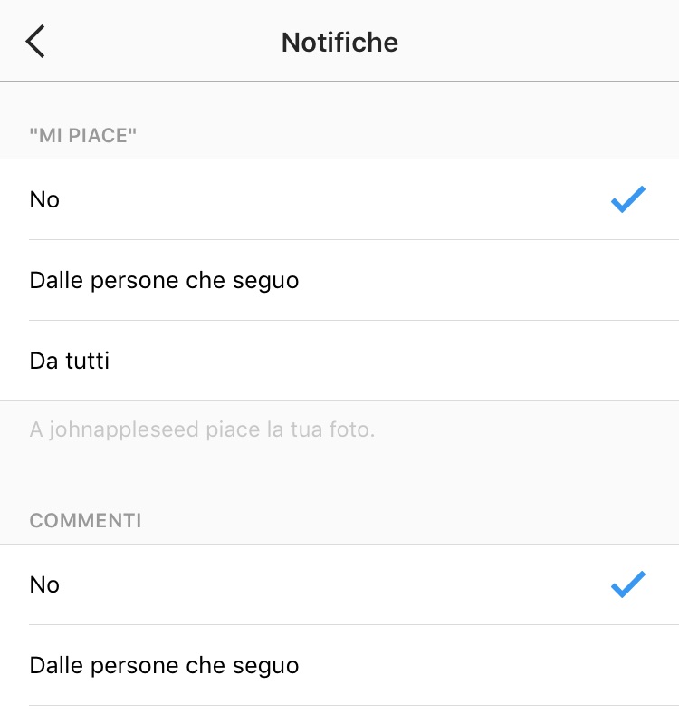 Su iOS, una volta lanciato Instagram, andate sul vostro profilo e cliccate sulla rotellina dell’ingranaggio. Scendete fino alla sezione Impostazioni e toccate “Impostazioni delle notifiche push”: selezionate soltanto le notifiche che volete ricevere e mettete “No” a tutto il resto.