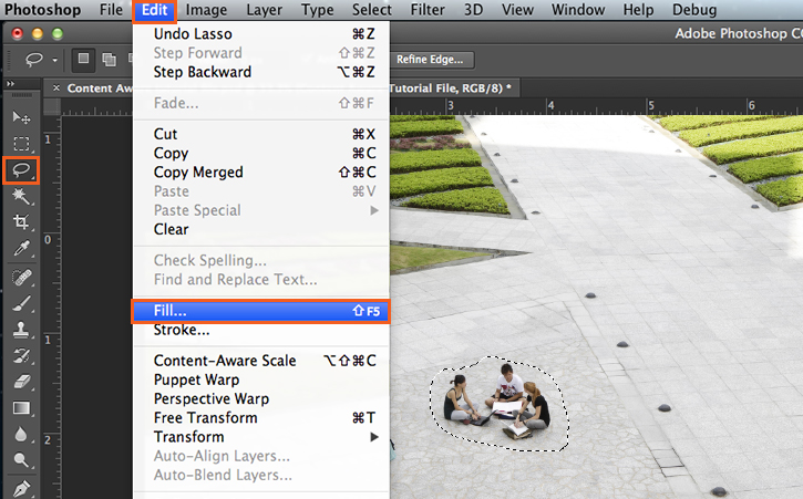 Lo strumento più rapido per eliminare degli oggetti sgraditi da una foto è il tool Fill > Content-Aware. Utilizzate il lasso per selezionare l’oggetto da togliere e un po’ di sfondo intorno a esso, cliccate su Edit > Fill > selezionate Content-Aware dal menù a tendina. Controllate che vi sia la spunta su Color Adaptation.
