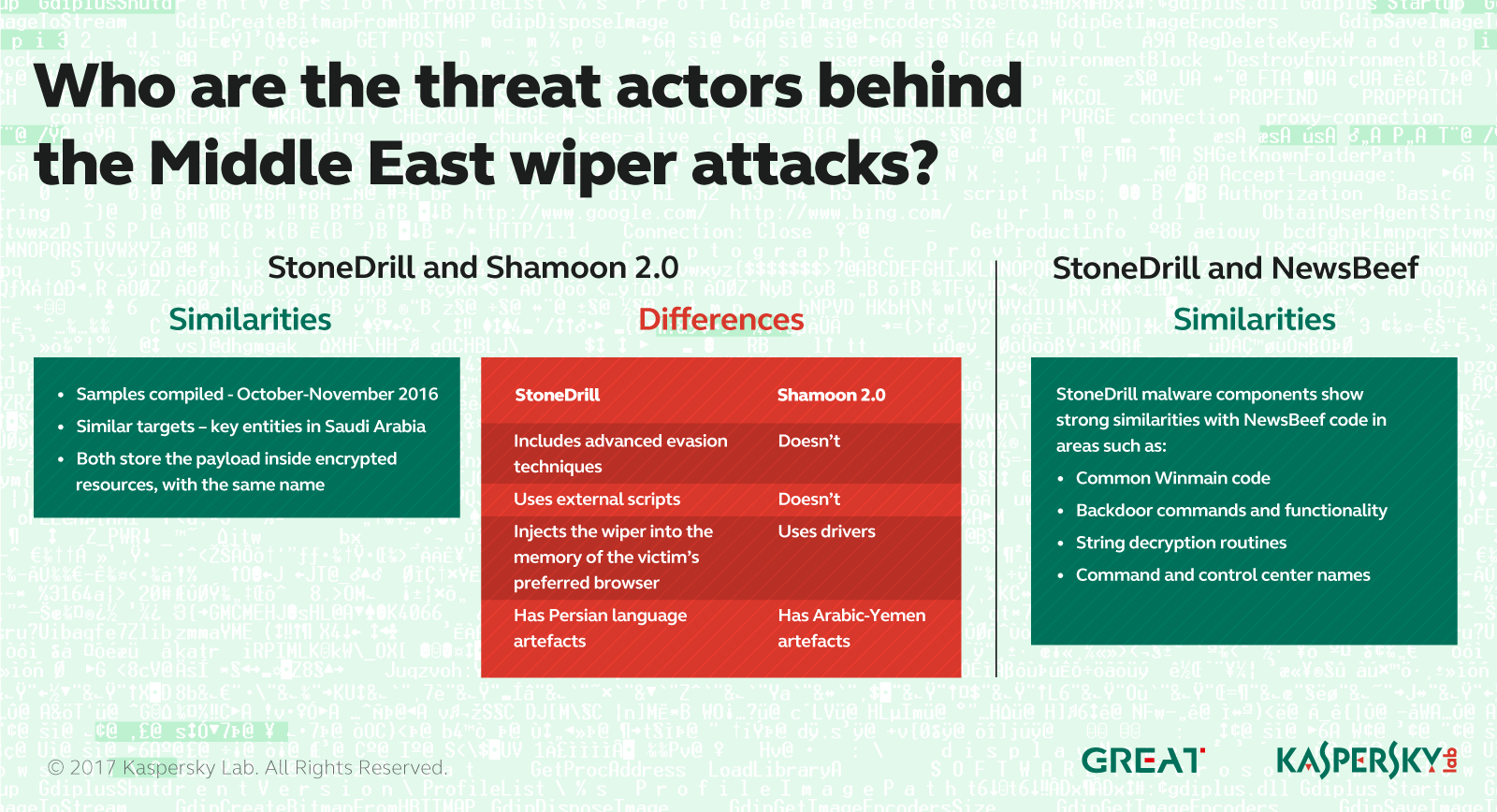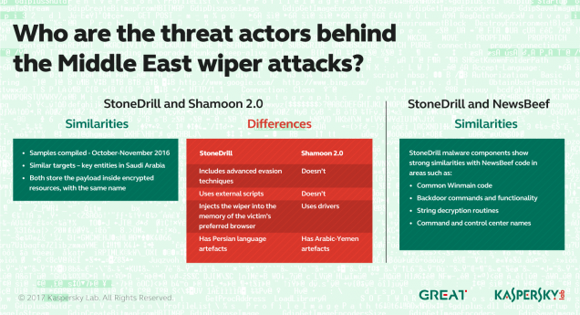 Le due minacce condividono stesse parti di codice, ma non si capisce se gli hacker responsabili portino avanti un progetto comune. StoneDrill riutilizza il codice in una campagna di spionaggio chiamata “NewsBeef” che ha già colpito numerose organizzazioni a livello internazionale. Secondo quanto dichiarato dai ricercatori Kaspersky: