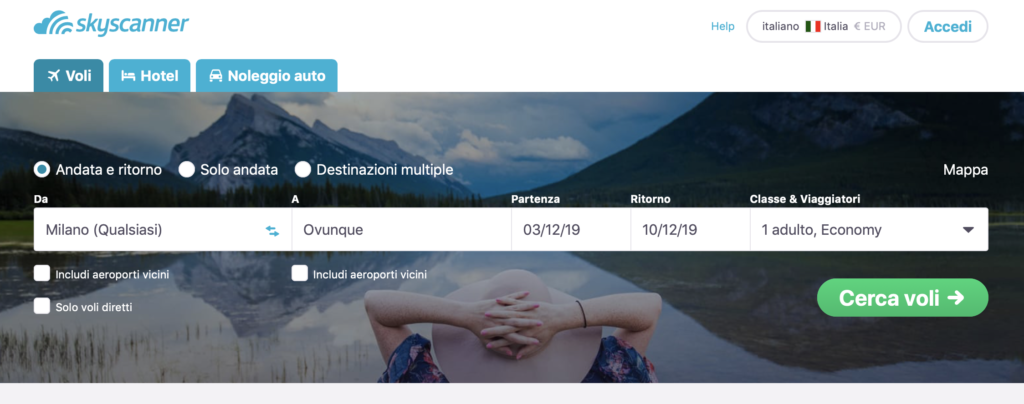 Skyscanner è semplice, intuitivo e quindi accessibile a tutti. Ti basterà entrare nel sito o nell’applicazione mobile e metterti subito alla ricerca, anche senza registrazione. La schermata principale che appare ti propone di scegliere tra “Voli”, “Hotel” o “Noleggio auto”. Una volta scelta l’opzione che ci interessa, dovremo decidere il periodo in cui vogliamo partire e da quale e per quale città vogliamo partire, o dove vogliamo alloggiare o affittare un’auto. Prendiamo l’esempio del volo e vediamo quale sarebbe, in questo caso, il procedimento da seguire: