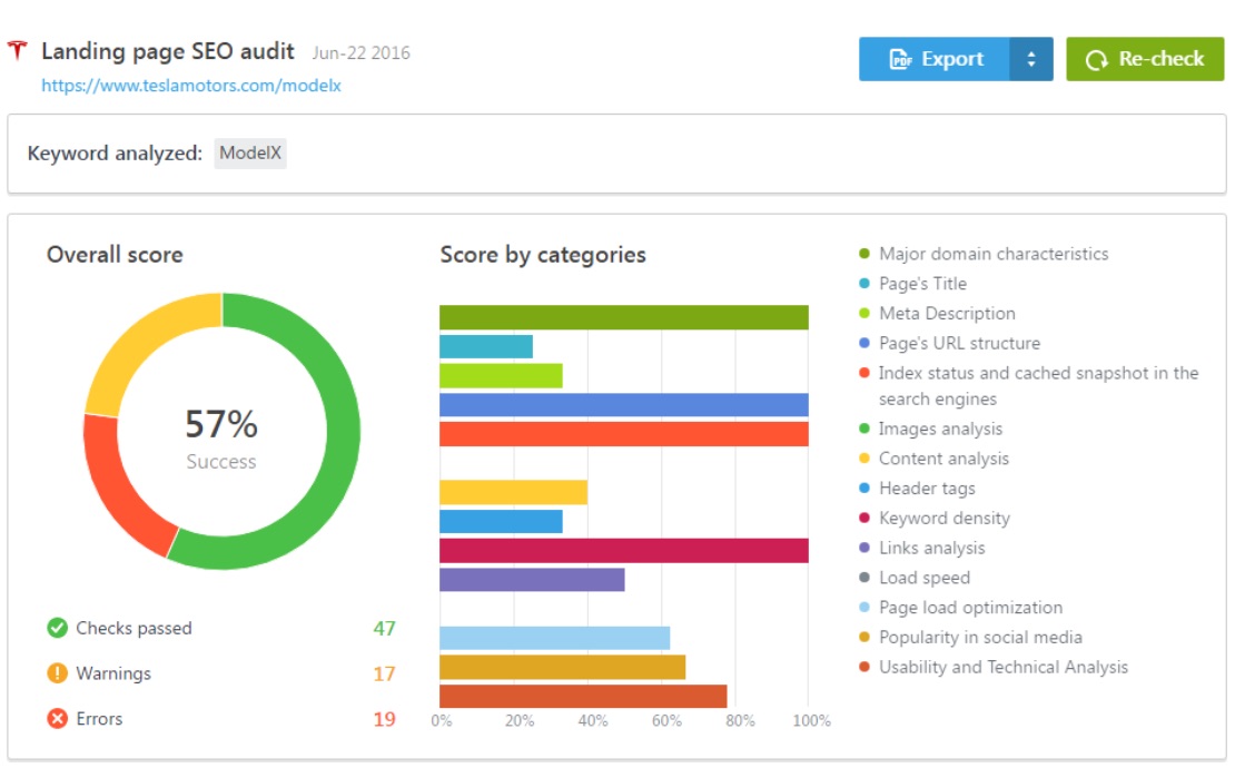 I risultati salvati nei report possono essere aggiornati continuamente. Possiamo decidere per quale periodo riceverlo e controllarne lo stato di aggiornamento diverse volte al giorno… Se proprio siete così impazienti. La funzionalità SEO Audit permette di creare grafici colorati che ci mostrano l’effettiva efficacia delle diverse categorie SEO per una keyword selezionata su una specifica pagina. Con un colpo d’occhio possiamo capire in quale punto la nostra pagina è debole e ha bisogno di intervento.