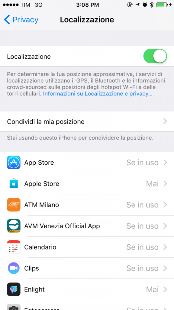 Toccate Impostazioni > Privacy > Localizzazione: troverete l’elenco delle app che fanno uso dei servizi di geolocalizzazione: abilitatene o disabilitatene l’utilizzo a seconda dell’app. Alcune offrono come opzione “Sempre” oppure “Mai”, altre hanno sfumature come “Mentre usi l’app”: valutate caso per caso.